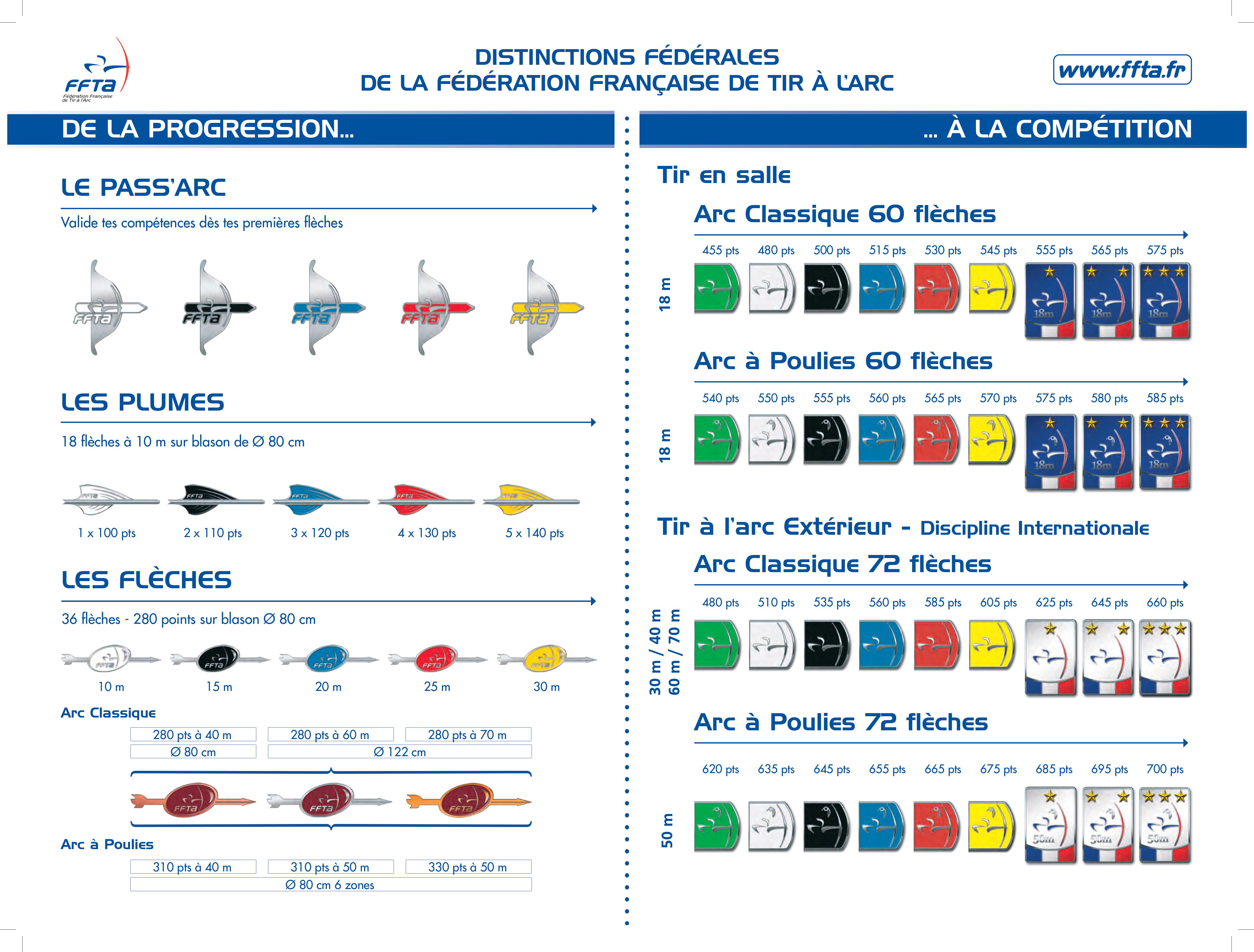 Pour chaque discipline de tir à l'arc, en fonction des points réalisés, des distinctions (badges) FFTA peuvent être demandées au Président en exercice.